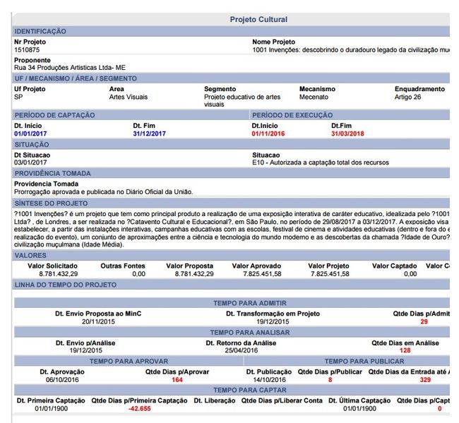 A íntegra do projeto pode ser lida no site do Ministério da Cultura (aqui). Basta ir no menu Consultar, Projeto e colocar o número 1510875 no Pronac.